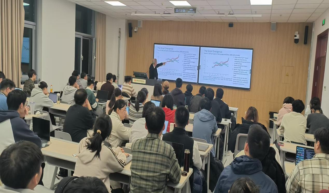 整场讲座逻辑严谨、数据翔实,布罗德伯里教授以深厚的学术积淀和清晰的分析框架为师生们揭示了 “大分流” 现象背后的深层经济逻辑。互动环节中,师生们围绕讲座核心内容积极提问,就制度设计对创新的影响、地理因素的具体作用机制等问题与教授展开深入交流。